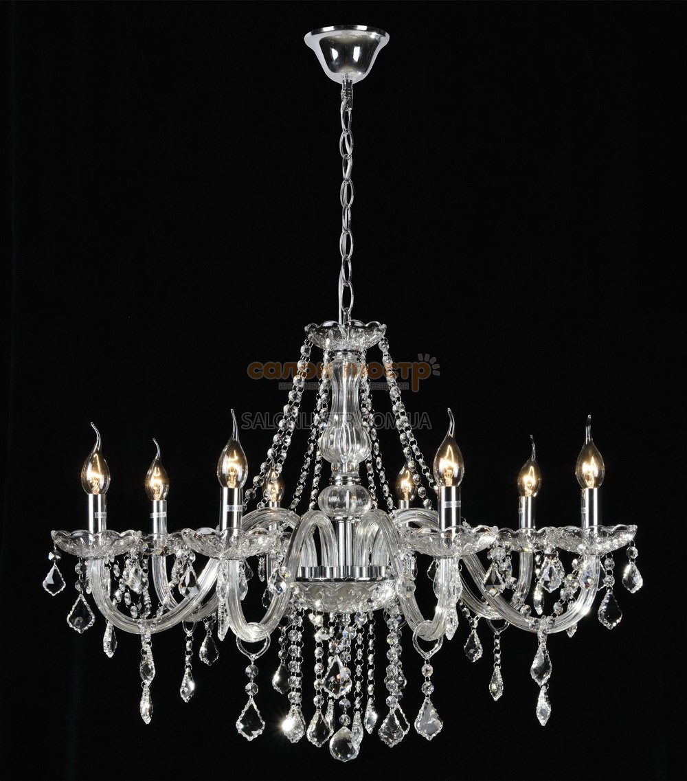 Люстра кришталева виробництва компанії " Wunderlicht" (Німеччина); Матеріал: метал, скло, кришталь; Колір основи: хром; Колір кришталю: прозорий; Висота: 70-100 см; ширина: 70 см; лампи: 8 х E14 х 60 Вт.