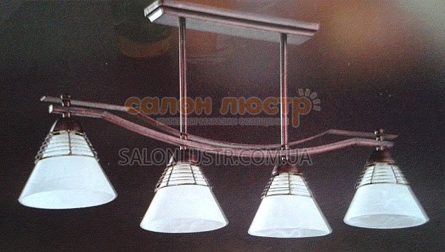 Люстра стельова виробництва компанії TINKO; Матеріал: метал, скло; Колір основи: антична мідь із патиною; Колір плафонів: білий матовий з мармуровим малюнком; Висота: 42 см; довжина: 83 см; лампи: 4 х Е27 х 60 Вт.