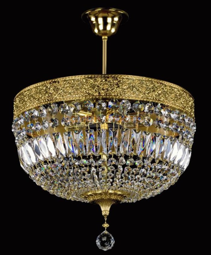 Люстра стельова кришталева виробництва чеської компанії Art Glass; Матеріал: метал, кришталь; Колір (підстави): Gold (золото); Тип (кришталю): Classic(прозорий); Висота: 45 см; діаметр: 42 см; лампи: 6 х Е-14 х 40 Вт.