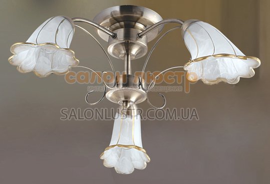 Люстра пристільна виробництва компанії Tinko; Матеріал підстави: метал, скло; Колір підстави: бронза; Колір плафона: білий+золото; Висота: 20 см; діаметр: 55 см; лампи: 3 х Е-14 х 60 Вт.