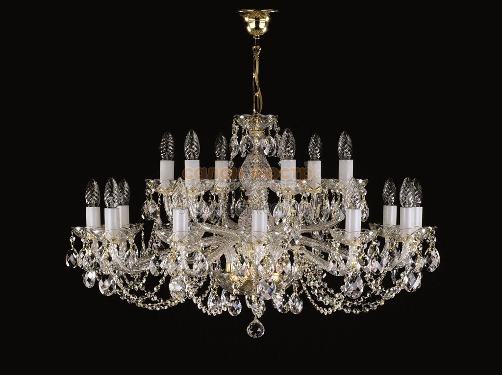 Люстра кришталева виробництва чеської компанії Art Glass; Матеріал: метал, кришталь; Колір (підстави): Gold (золото); Тип (кришталю): Crystal Exclusive; Висота: 59 см; діаметр: 84 см; лампи: 18 х Е-14 х 40 Вт.