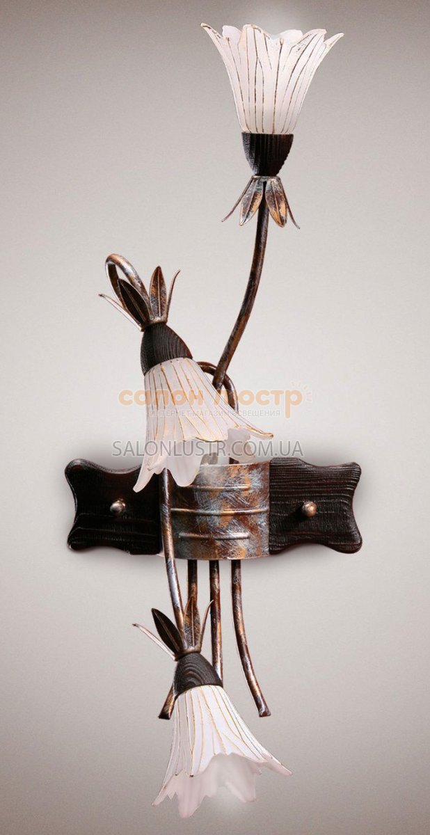 Світильник настінний (бра) серії Венеція виробництва компанії "N&B Light" (Україна); Матеріал: фарбований метал (ручний розпис), натуральне дерево, скляний плафон; Колір (підстави): Коричневий - салатовий; Плафон: Еволюзіон Д15 Колір (плафона): Білий - золото; Висота: 65 см; ширина: 24 см; лампи: 3 х Е-14 х 60 Вт.