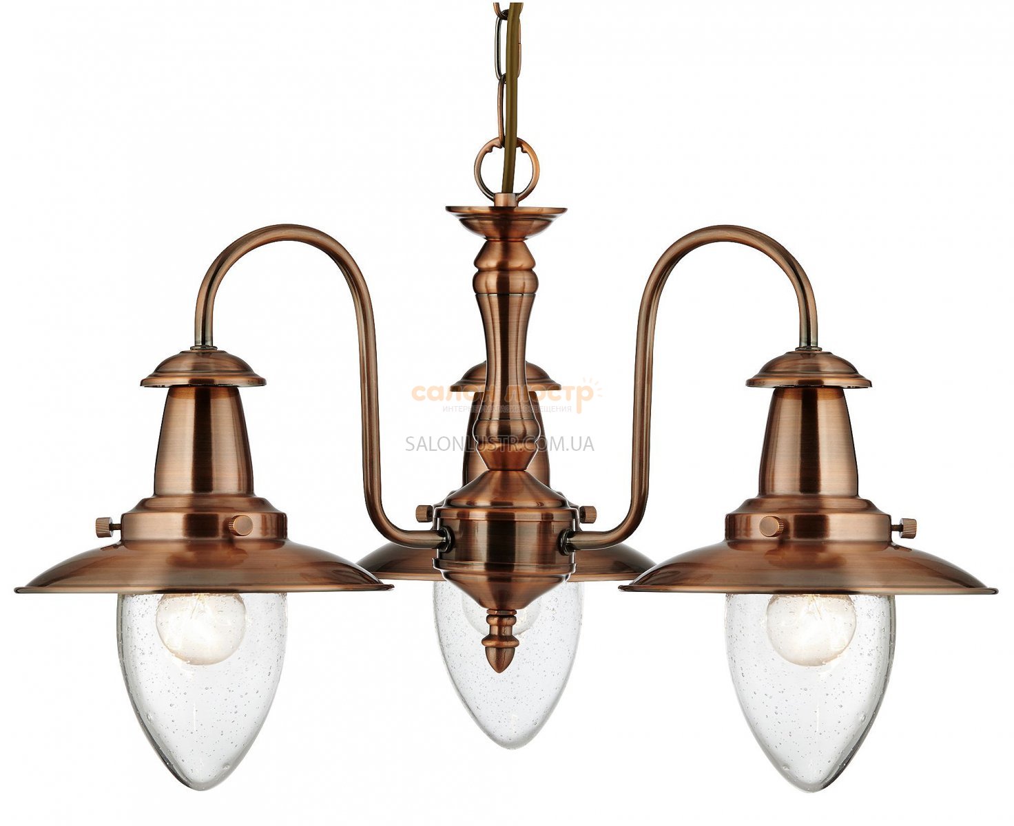 Люстра підвіс лофт виробництва компанії SEARCHLIGHT (Великобританія); Матеріал: метал, скло; Колір підстави: мідь; Колір плафона: прозорий; Висота: 40-86 см; ширина: 52 см; лампа: 3 х E27 х 60 Вт.