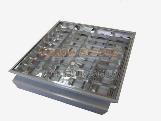 Растровий світильник ЛВО 4х18 ULTRALIGHT. Розмір 595*595 мм, Люмінесцентні лампи 18W у комплекті. Корпус-Сталь, товщина 0,35 мм, Відбивач -алюміній. 8 ламелей, компенсація -4.7мф, 2 електромагнітних баласту (магнітний сердечник 75 мм) + 4 стартера, Упакування - 3-х шаровий картон бел.кольору.