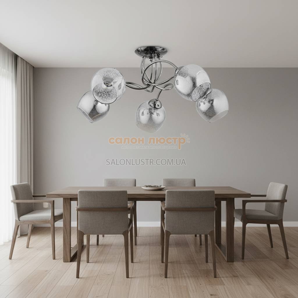Висота: 28 см; ширина: 68 см; лампи: 5 х Е27 х 60 Вт.