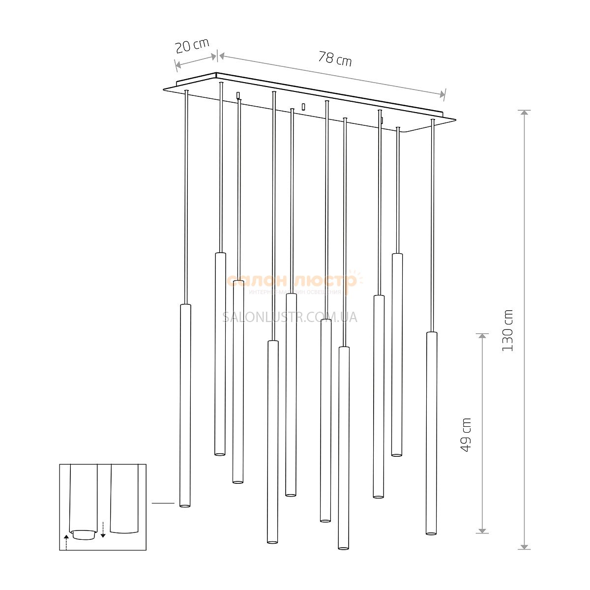Висота 63-130 см; довжина: 78 см; лампи: 10 х G9 х 10 Вт LED;