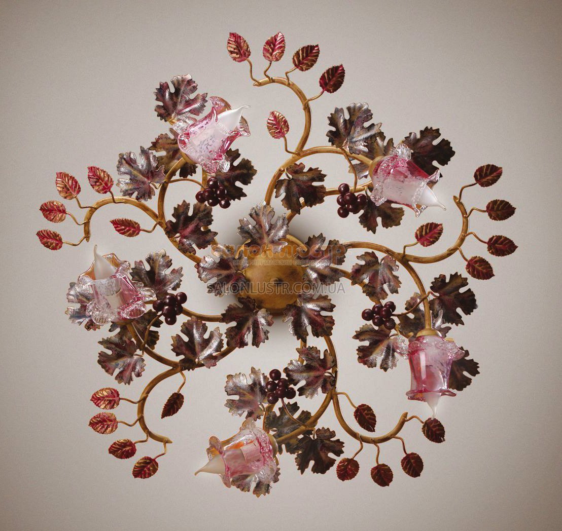 Люстра флористика виробництва Україна; Матеріал: фарбований метал (ручний розпис), скло; Колір основи: Ізабелла; Ім'я плафона: Роатан; Колір плафонів: Рожевий; Висота: 22 см; діаметр: 76 см; лампи: 5 х Е-14 х 60 Вт.