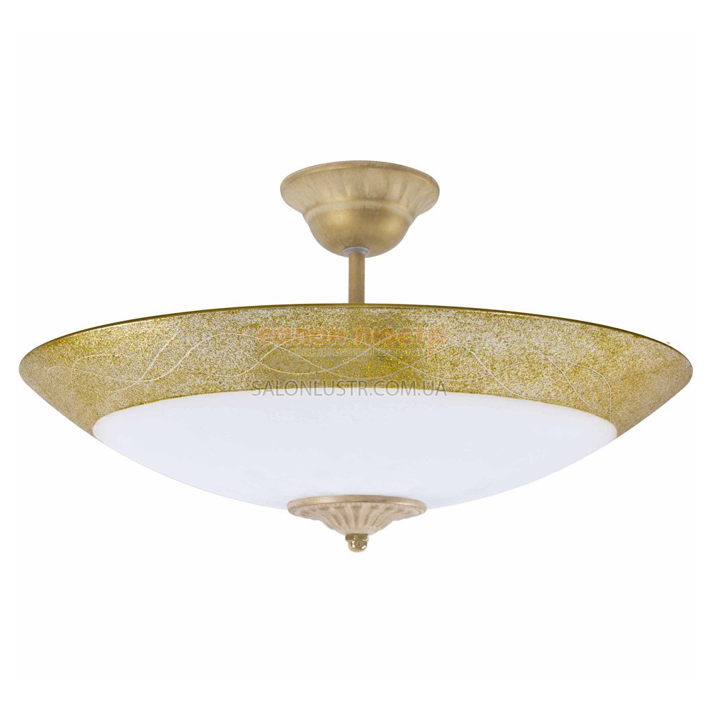 Світильник виробництва компанії "Декору" (Україна); Матеріал: метал, скло; Колір основи: старе золото з патиною; Колір плафона: білий+золото; Висота: 20 см; ширина: 40 см; лампи: 3 х Е27 х 60 Вт.