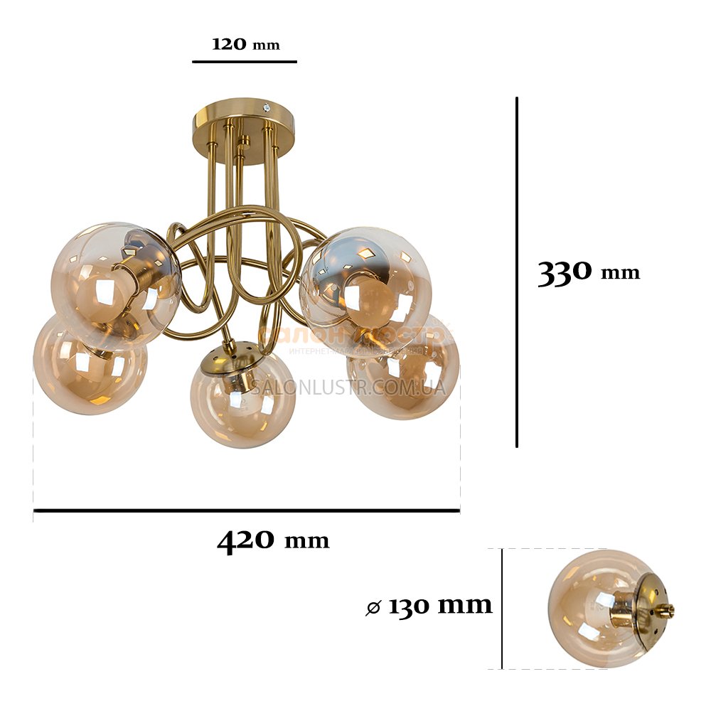 Висота: 33 см; ширина: 42 см; лампи: 5 х Е27 х 60 Вт.