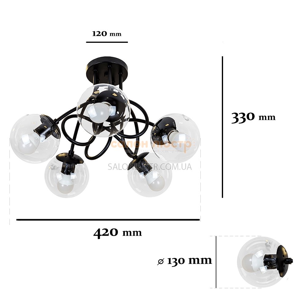 Висота: 33 см; ширина: 42 см; лампи: 5 х Е27 х 60 Вт.