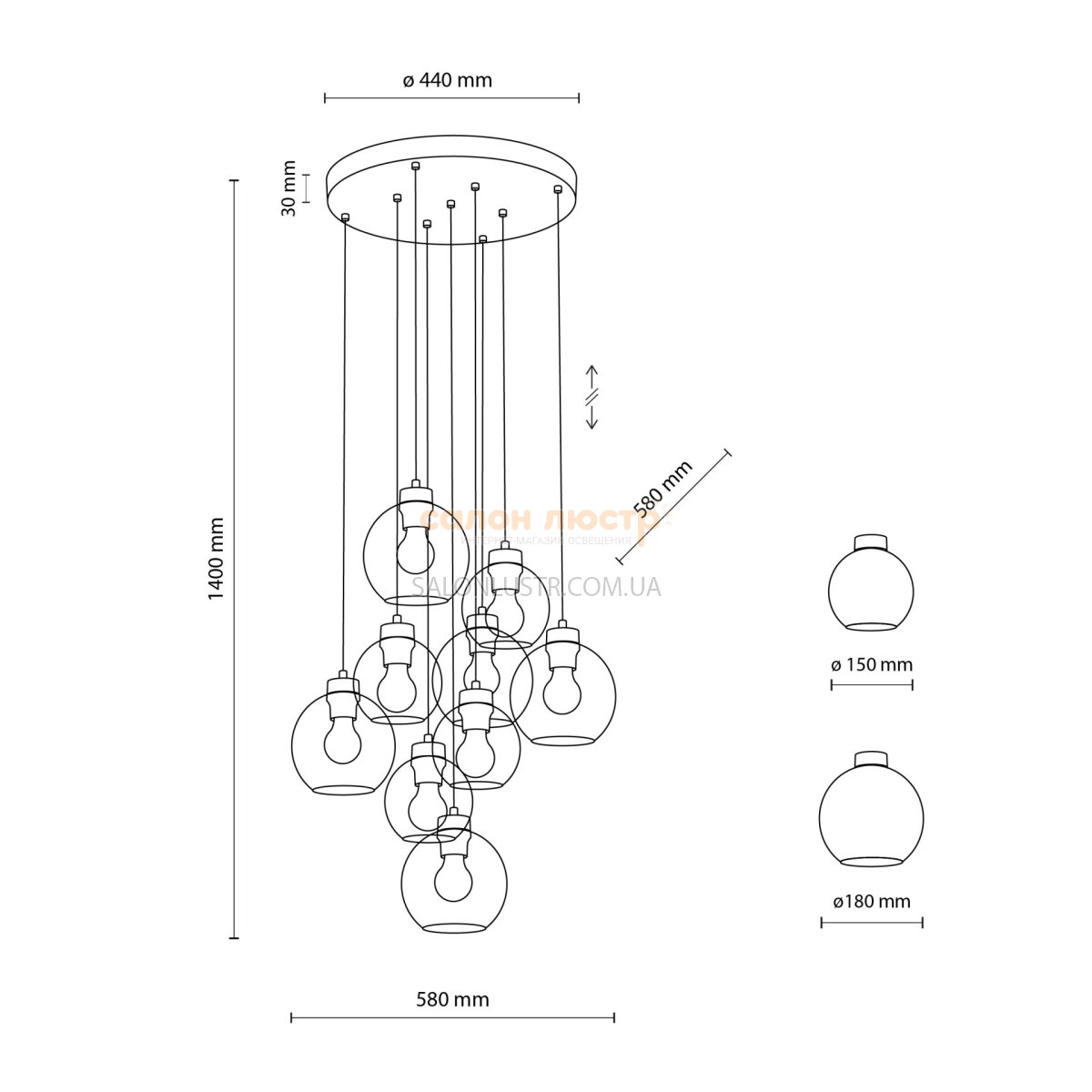 Висота: 70-140 см; ширина: 58 см; лампи: 9 х Е27 х 60 Вт;