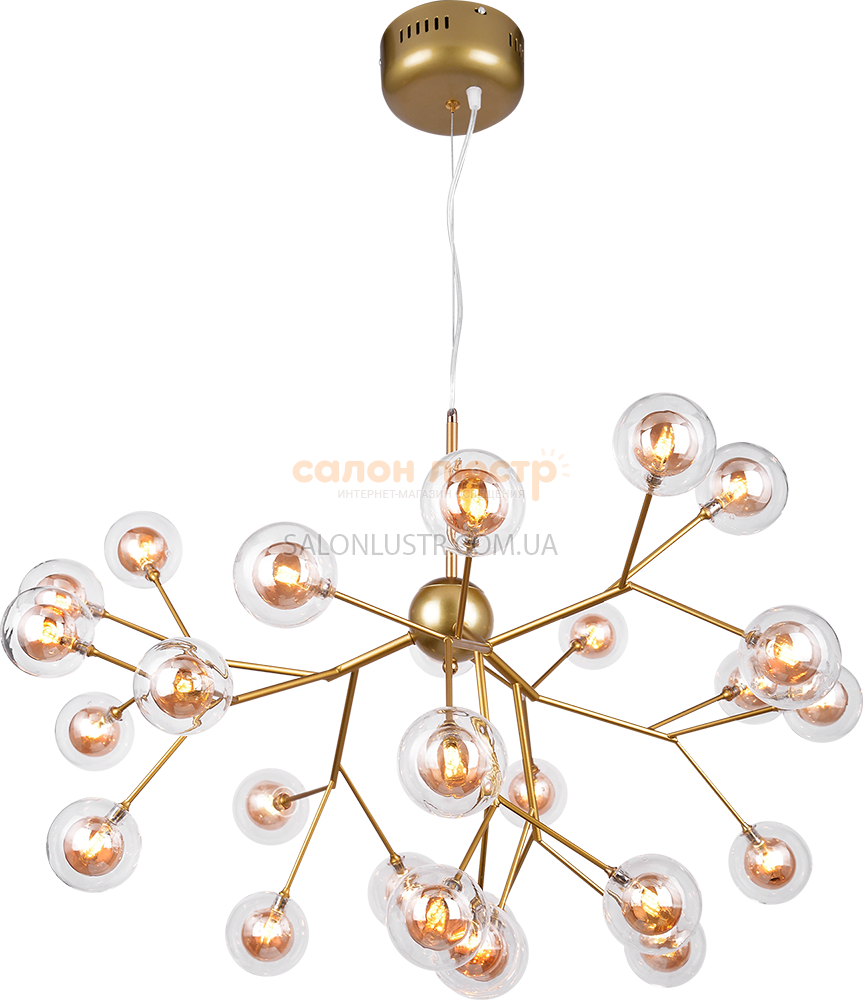 Люстра сучасна виробництва компанії WUNDERLICHT (Німеччина); Матеріали: метал, скло; Колір основи: золото; Колір плафона: прозорий; Висота: 55-87 см; діаметр: 80 см; лампи: 27 х G4/LED х 3Вт.