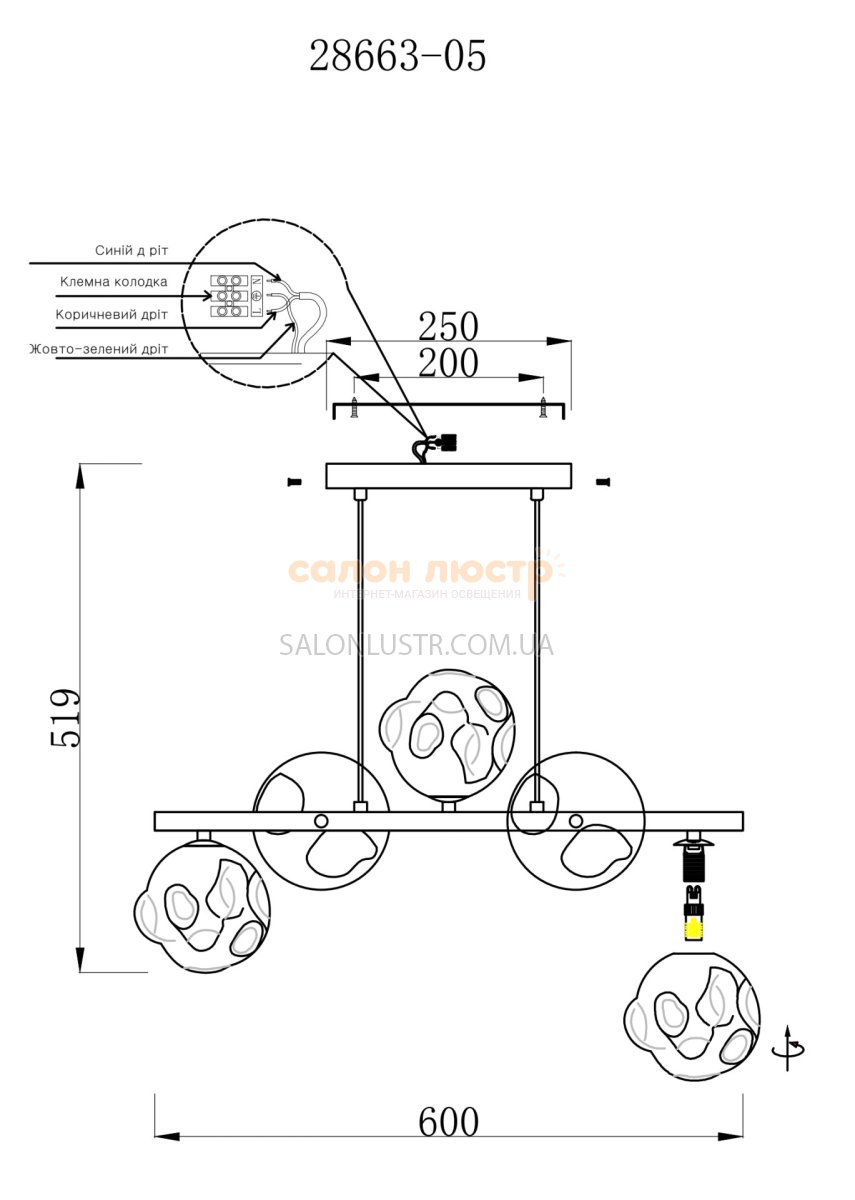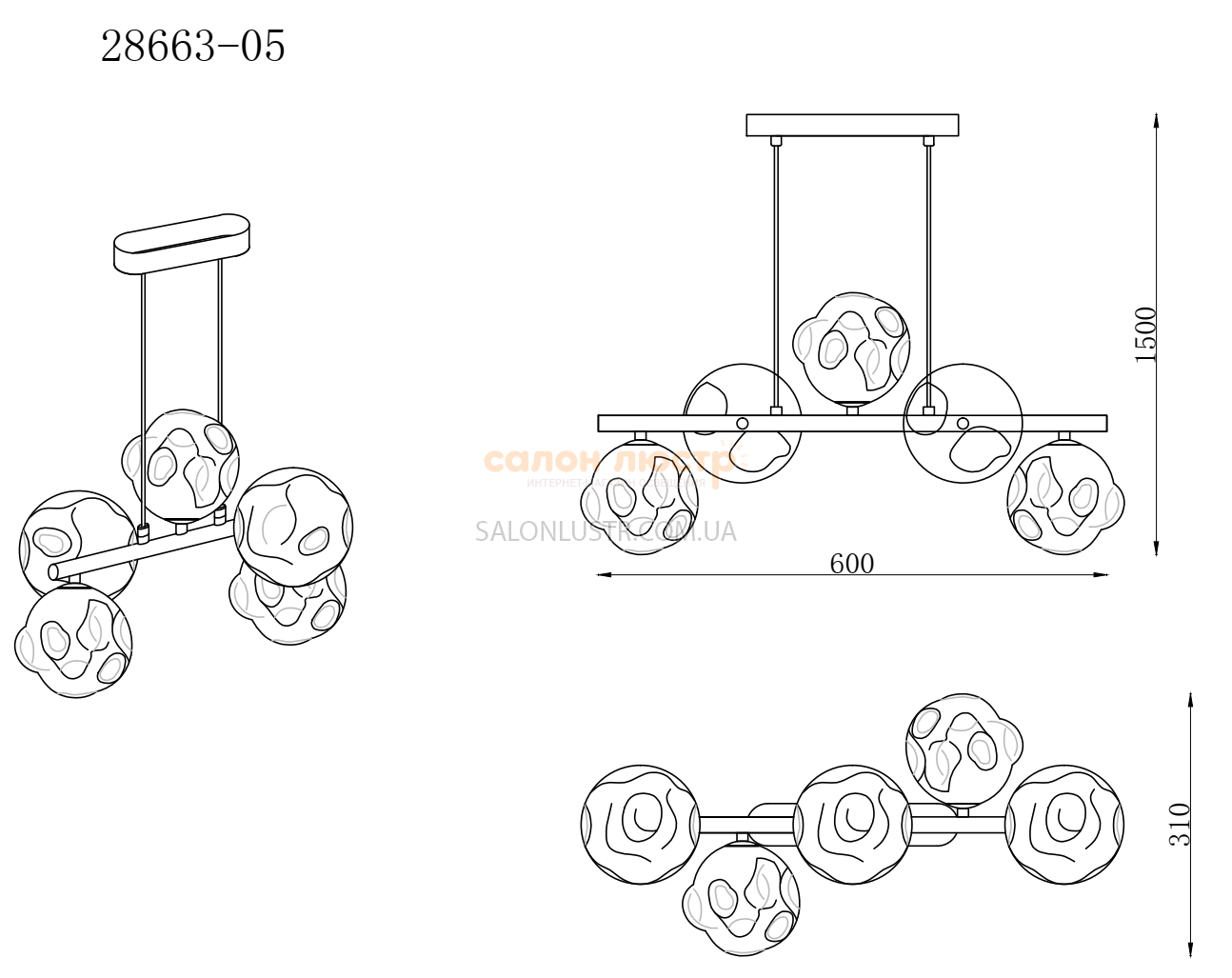 Висота: 50-150 см; ширина: 65 см; лампи: 5 х G9 х 10 Вт LED.