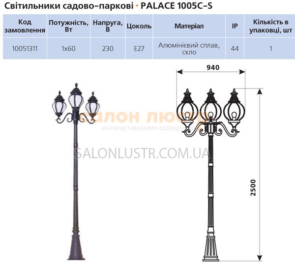 Матеріал: алюмінієвий сплав, скло; Колір: чорний; Висота: 250 см; ширина: 94 см; лампи: 3 х Е27 230V 60W; Ступінь захисту від води й пили: IP 44;У світильнику садово-парковому Delux Palace 1005E/3A-S для зовнішнього висвітлення можливо використовувати: лампу розжарювання, енергозберігаючу лампу, LED лампу.