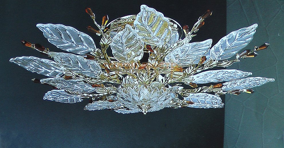 Люстра пристільна виробництва компанії Tinko; Матеріал: метал, скло; Колір підстави: золото; Колір плафонів: прозорий; Декоративний елемент: коричневе скло; Висота: 26 см; діаметр: 67 см; лампи: 8 х Е-14 х 60 Вт+2 x G9 40 Вт.