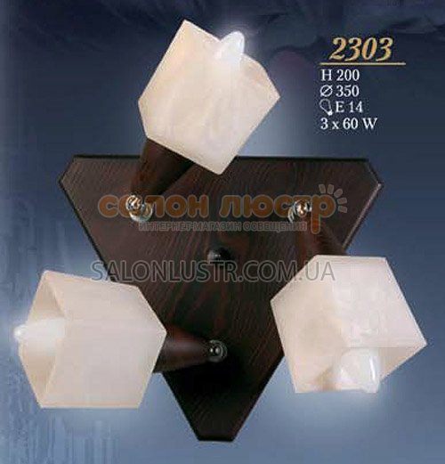Люстра пристельова виробництва Україна; Матеріал: метал, скло, натуральне дерево; Колір основи: венге, дуб; Колір плафона: білий матовий; Висота: 20 см; діаметр: 35 см; лампи: 3 х Е-14 х 60 Вт.