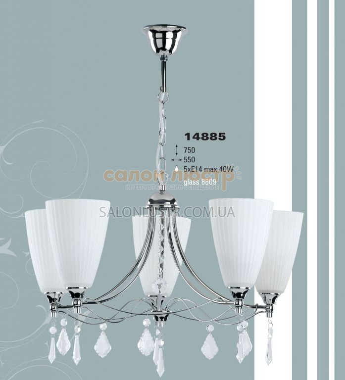 Висота: 75 см; діаметр: 50 см; лампи: 5 х Е14 х max 40 Вт;
