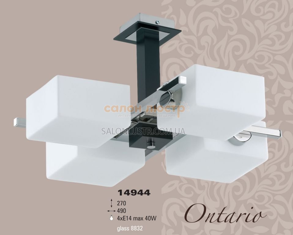 Висота: 27 см; діаметр: 49 см; лампи: 4 х Е14 х 60 Вт.