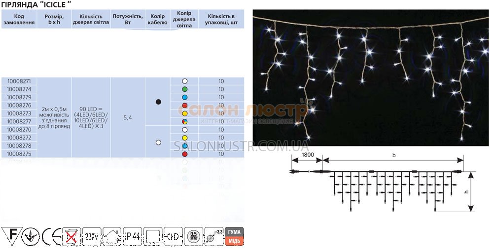 - DELUXДовжина: 2 метра; висота: 0, 5 метра; колір світлодіодів: мультик(різнобарвний); колір кабелю: чорний; кількість світлодіодів: 90 шт, можливість з'єднання до 8 гірлянд від одного джерела живлення.