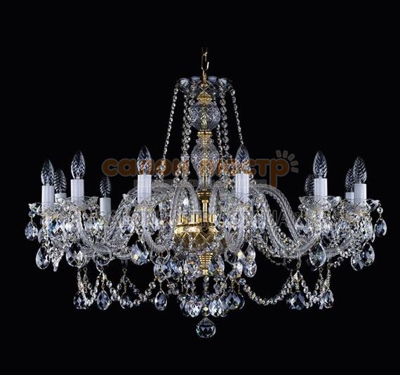 Люстра кришталева виробництва чеської компанії Art Glass; Матеріал: метал, кришталь; Колір (підстави): Gold (золото); Тип (кришталю): Classic (прозорий); Висота: 70 см; діаметр: 95 см; лампи: 12 х Е-14 х 40 Вт.