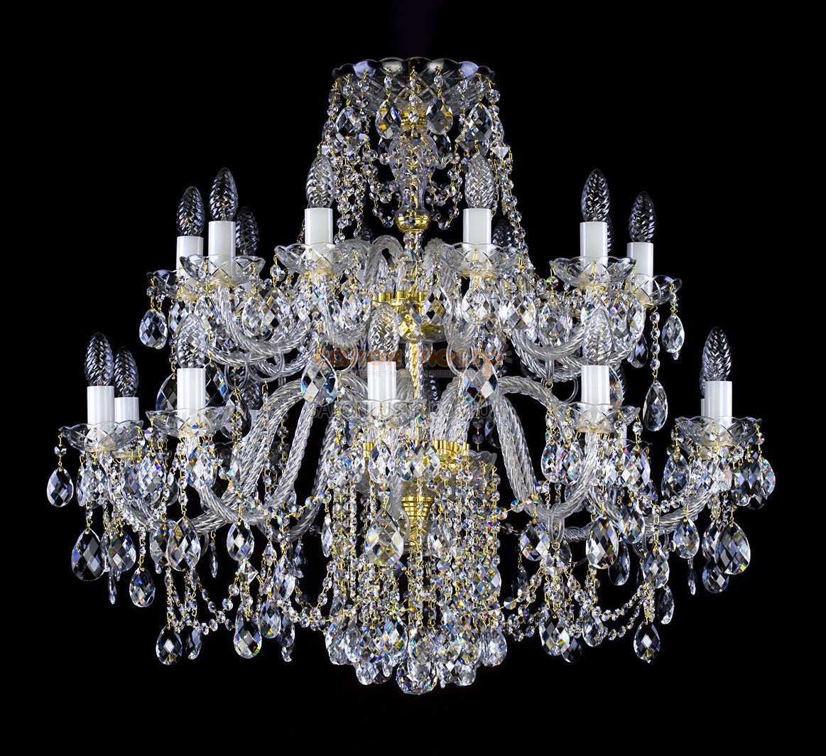 Люстра кришталева виробництва чеської компанії Art Glass; Матеріал: метал, кришталь; Колір (підстави): Gold (золото); Тип (кришталю): Classic (прозорий); Висота: 76 см; діаметр: 86 см; лампи: 20 х Е-14 х 40 Вт.