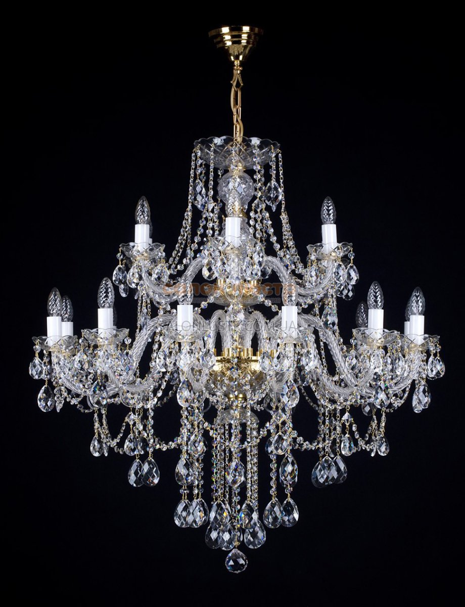 Люстра кришталева виробництва чеської компанії Art Glass; Матеріал: метал, кришталь; Колір (підстави): Gold (золото); Тип (кришталю): Зlassic (прозорий); Висота: 100 см; діаметр: 95 см; лампи: 18 х Е-14 х 40 Вт.