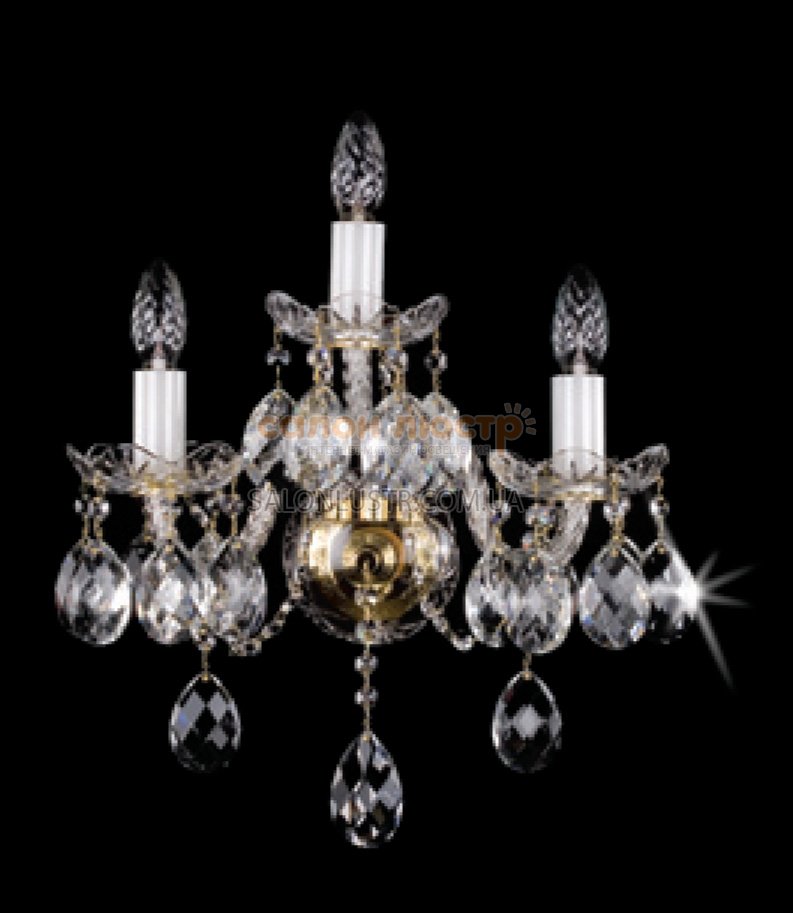Бра серії Tibora виробництва компанії ARTGLASS; Матеріал : метал під золото або хром, кришталь (classic, crystal exclusive, spectra); Висота: 34 см діаметр: 34 см лампи: 3 х Е-14 х 40 Вт.