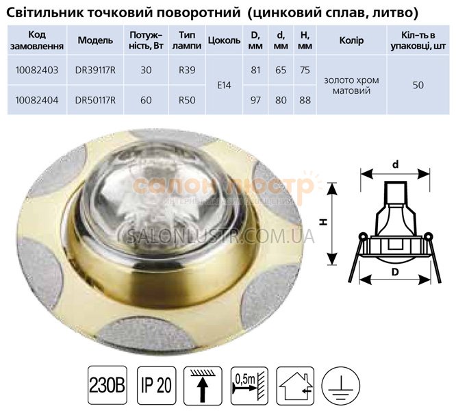 Крапковий світильник поворотний виробництва компанії DELUX; Матеріал: метал(цинковий сплав,лиття); Колір: золото мат.-хром; Висота: 8,8 см; діаметр: 9,7 см; лампи: 1рефлекторна лампа R50,цоколь Е14;напруга:230В;потужність: 60Вт,40Вт. Також, можливо використовувати енергозберігаючі лампочки EXR 50 9Вт, приблизно рівної потужності 45Вт лампи розжарювання або EXR 50 7Вт, приблизно рівної потужності 35Вт лампи розжарювання або EXR 50 5Вт,рівної 25Вт.