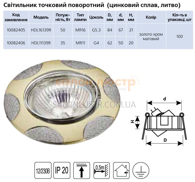Крапковий світильник поворотний виробництва компанії DELUX; Матеріал: метал (цинковий сплав,лиття); Колір: золото мат.-хром; Висота: 2,1 см; діаметр: 8,4 см; лампи: 1галогенна лампа MR16,цоколь G5,3;напруга: 12В/230В;потужність: 50Вт,35Вт,20Вт. Для лампочок 12В потрібний трансформатор або кілька трансформаторів, потужністю не менше сумарної потужності всіх лампочок. Також можливо використовувати енергозберігаючі лампочки EMR 16 9ВТ приблизно рівної потужності 40Вт лампи розжарювання.