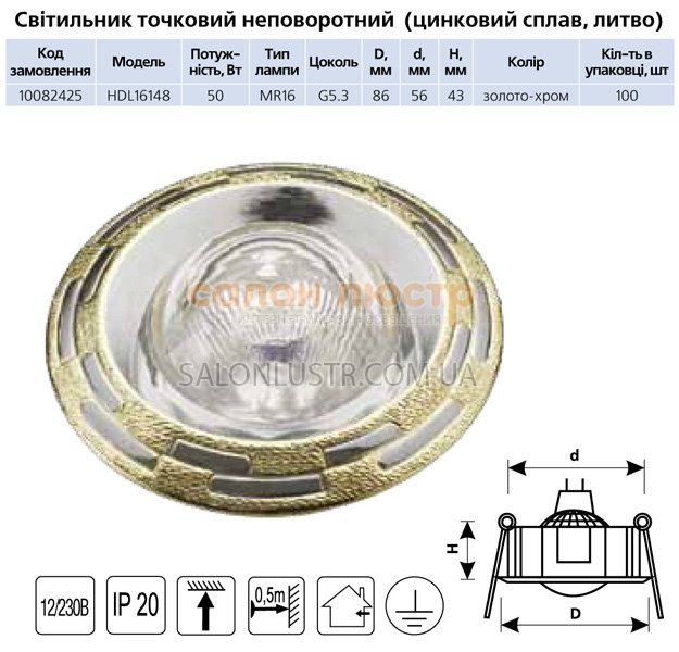 Крапковий світильник не поворотний виробництва компанії DELUX; Матеріал: метал (цинковий сплав,лиття); Колір: золото-хром; Висота: 4,3 см; діаметр: 8,6 см; лампи: 1галогенна лампа MR16,цоколь G5,3;напруга: 12В/230В;потужність: 50Вт,35Вт,20Вт. Для лампочок 12В потрібний трансформатор або кілька трансформаторів, потужністю не менше сумарної потужності всіх лампочок. Також можливо використовувати енергозберігаючі лампочки EMR 16 9ВТ приблизно рівної потужності 40Вт лампи розжарювання.