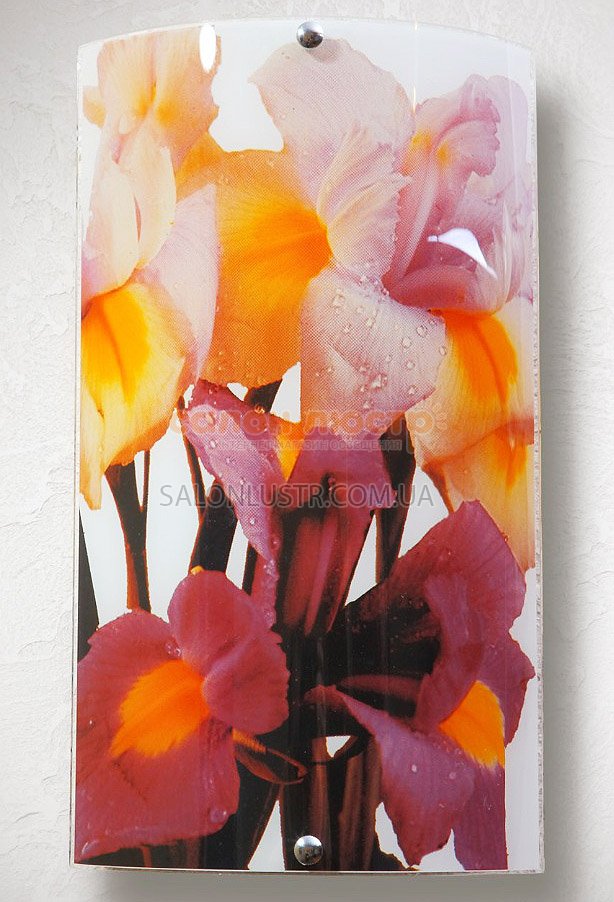 Світильник настінний виробництва Україна; Матеріал: метал, скло; Колір плафона: Ірис; Висота: 34 см; ширина: 19 см; лампи: 2 х Е-14 х 60 Вт.