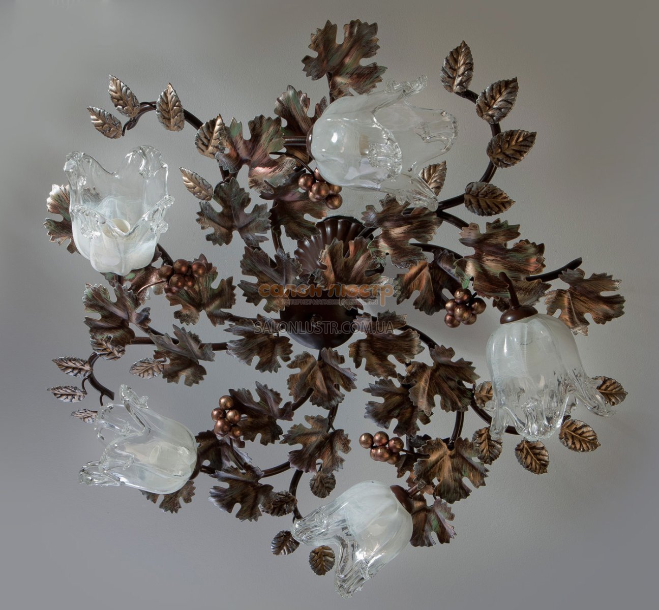 Люстра флористика виробництва Україна; Матеріал: фарбований метал (ручний розпис), скло; Колір основи: Коричневий - зелений - срібний; Ім'я плафона: Ліза нова; Колір плафонів: Білий; Висота: 22 см; діаметр: 76 см; лампи: 5 х Е-14 х 60 Вт.