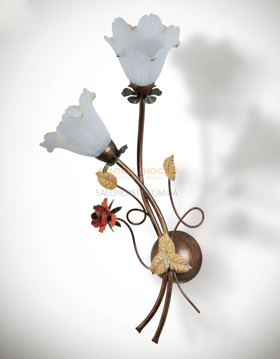 Світильник настінний (бра) виконаний у стилі флористика виробництва Україна; Матеріал: фарбований метал, скло; Колір основи: мідь-зелений-лак; Плафон: білий+бежевий; Висота: 56 см; ширина: 26 см; лампи: 2 х Е-14 х 60 Вт.