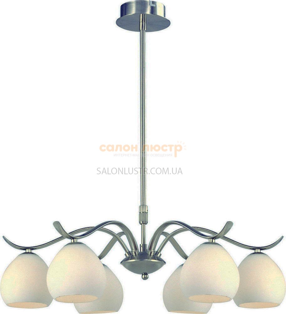 Люстра сучасна виробництва компанії "BLITZ" (Німеччина); Матеріал: метал, скло; Колір підстави: матовий хром; Колір плафона: білий; Висота: 67-100 см; ширина: 60 см; лампи: 6 х G9 х 40 Вт.