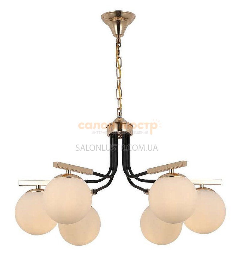 Люстра сучасна виробництва компанії "BLITZ" (Німеччина); Матеріал: метал, скло; Колір основи: чорний+золото; Колір плафона: білий; Висота: 65-80 см; діаметр: 57 см; лампи: 6 х Е-14 х 60 Вт.