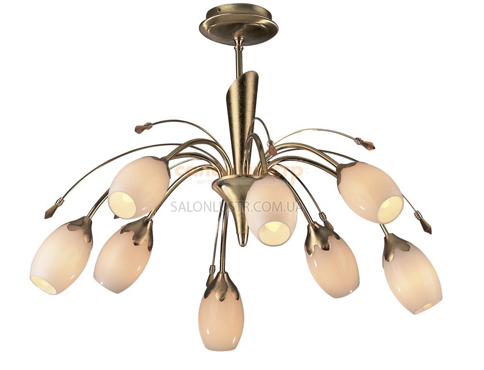 Люстра сучасна виробництва компанії "BLITZ" (Німеччина); Матеріал: метал / стекло; Колір підстави: матове золото; Колір плафона: білий глянсовий; Висота: 50 см; ширина: 71 см; лампи: 8 х Е14 х 40 Вт.