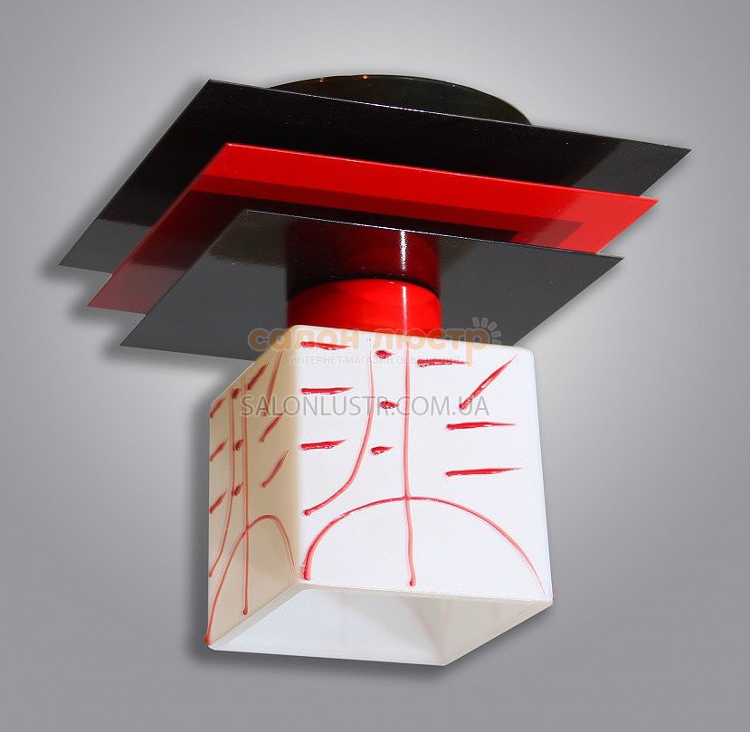 Світильник стельовий з декором виробництва компанії Україна; Матеріал: метал, скло; Колір підстави: Чорний глянець - червоний глянець; Плафон: Квадро середнє декор; Колір декору: Червоний; Висота: 19 см; ширина: 19 см; лампи: 1 х Е-27 х 60 Вт.