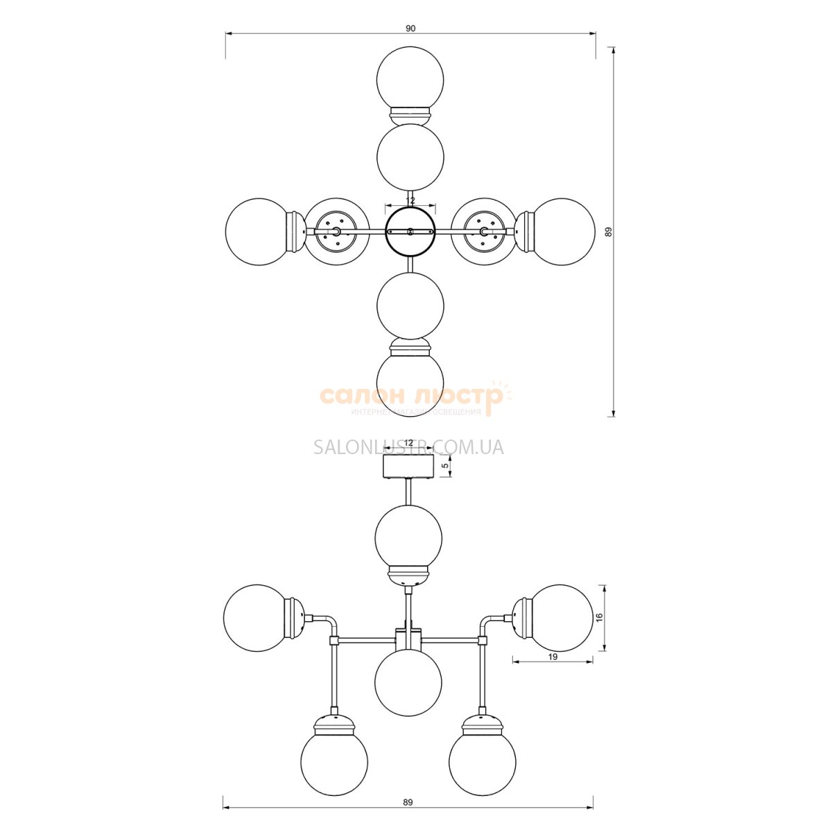 Висота: 75 см; ширина: 84 см; лампа: 8 х E27 х 60 Вт.