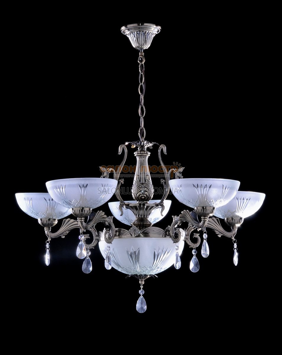 Люстра класична виробництва компанії TINKO; Матеріал: метал, колір: бронза; Плафон: стекло, колір: білий матовий з малюнком; Висота (з ланцюжком): 70-110 см; ширина: 78 см; лампи: 7 х Е27 х 60 Вт.