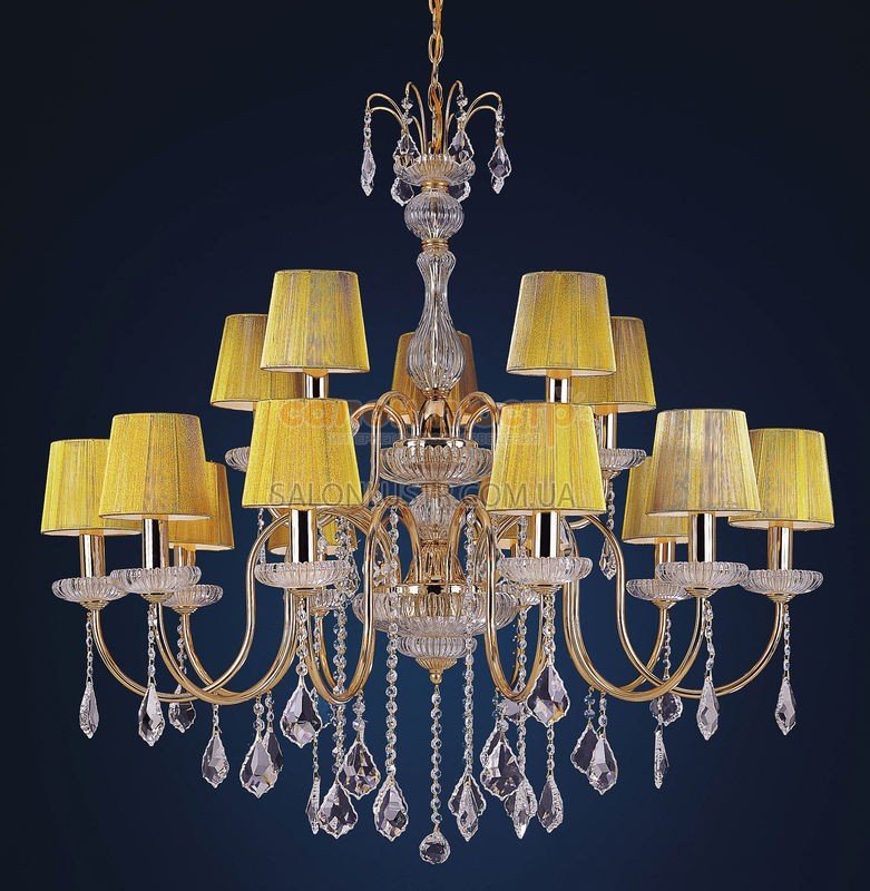 Люстра кришталева виробництва компанії WUNDERLICHT (Німеччина); Матеріали: метал, текстиль, кришталь; Колір: золото, жовтий, прозорий; Висота: 102-150 см; Ширина: 100 см; Тип патрона: Е14; Кількість ламп: 15; Потужність: 40 W.