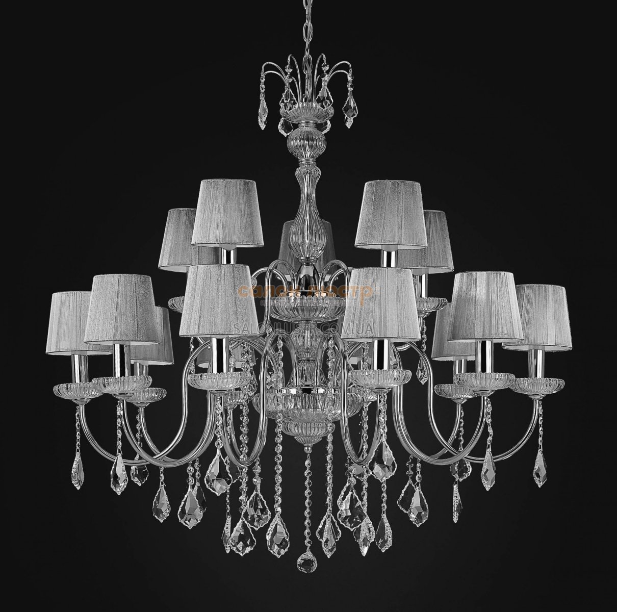 Люстра кришталева виробництва компанії WUNDERLICHT (Німеччина); Матеріали: метал, текстиль, кришталь; Колір: хром, сірий, прозорий; Висота: 120-150 см; Ширина: 100 см; Тип патрона: Е14; Кількість ламп: 15; Потужність: 40 W.