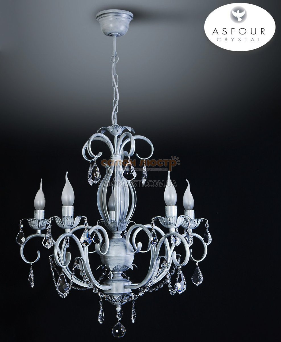 Люстра кришталева свічі виробництва Україна; Матеріал: фарбований метал, кришталь"ASFOUR"; Колір основи: Білий - срібло - патина; Висота: 67-97 см; ширина: 57 см; лампи: 5 х Е-14 х 60 Вт.