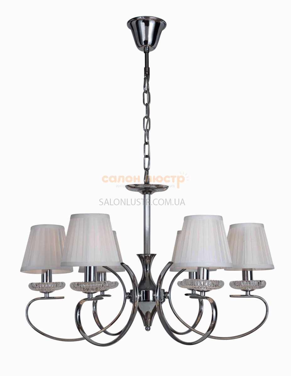 Люстра з абажурами виробництва компанії WUNDERLICHT (Німеччина); Матеріали: метал, текстиль, скло; Колір основи: хром; Колір плафона: білий; Висота: 50-70 см; Ширина: 60 см; Тип патрона: Е14; Кількість ламп: 6; Потужність: 60 Вт.