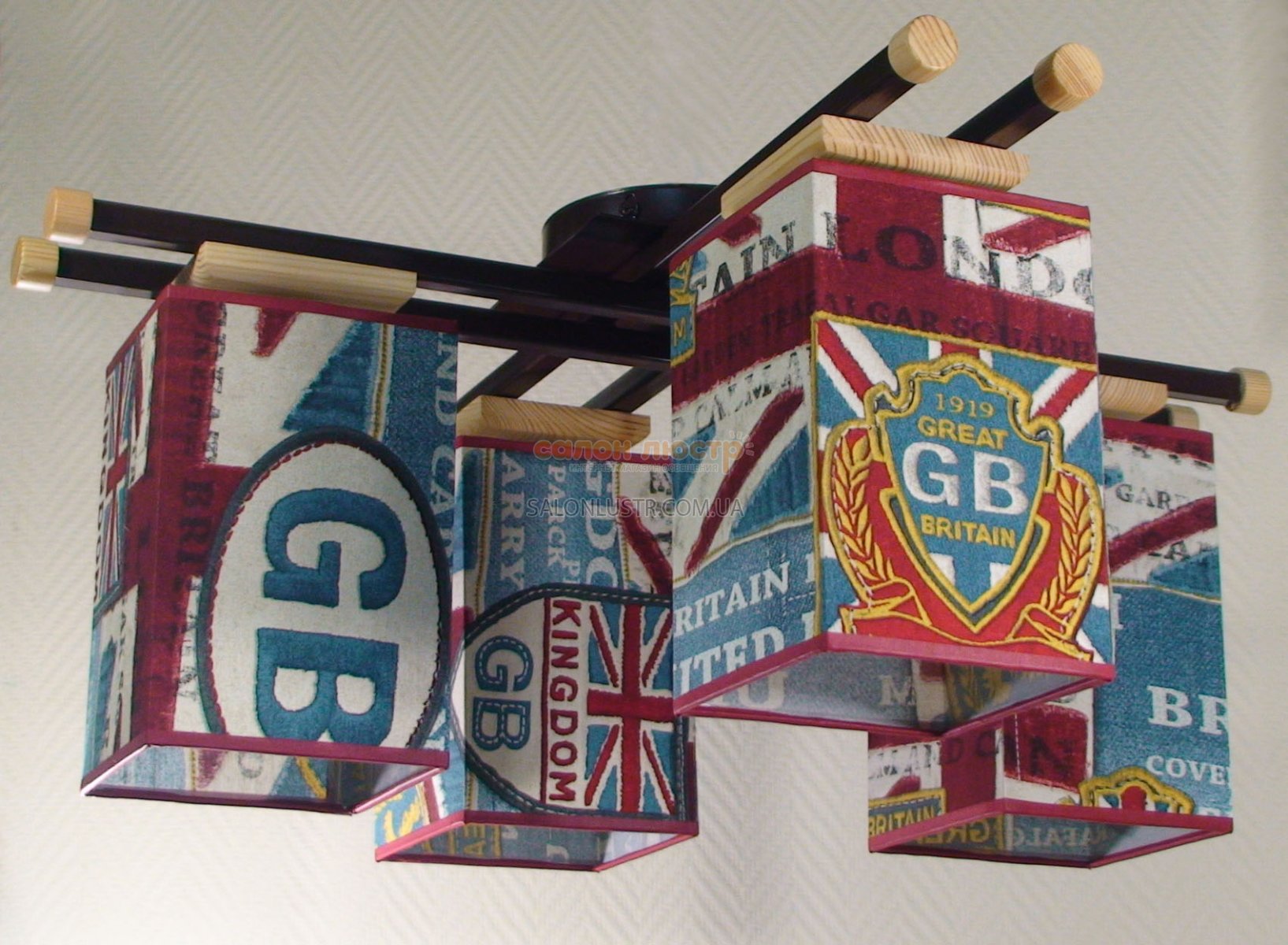 Люстра стельова виробництва Україна; Матеріал: метал, натуральне дерево, полімер, текстиль; Колір основи: Коричневий+сосна; Абажур: 10P0906; Висота: 18,5 см; діаметр: 62 см; лампи: 4 х Е-27 х 60 Вт.