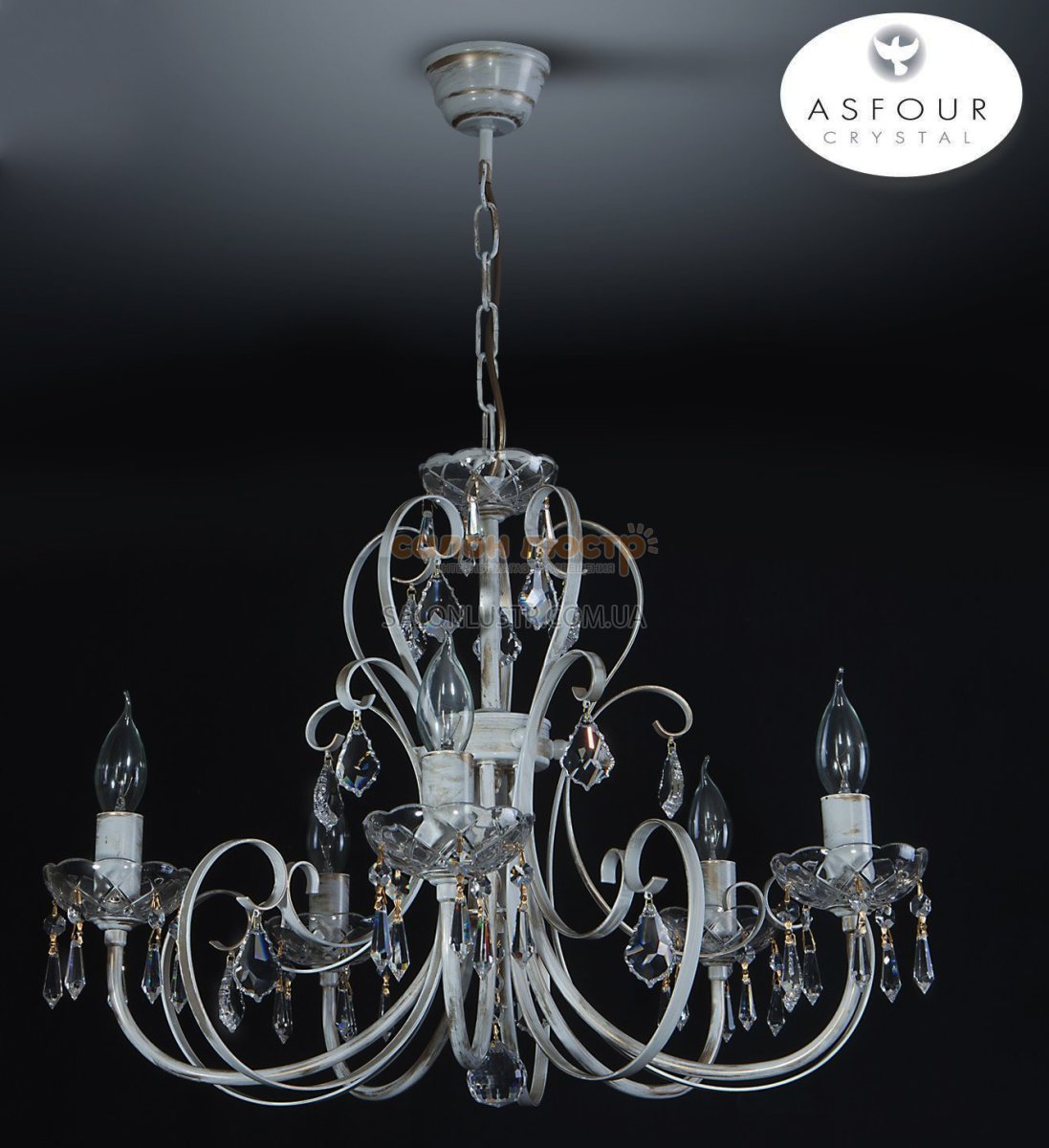 Люстра класична свічі із кришталем виробництва Україна; Матеріал: фарбований метал, кришталь"ASFOUR"; Колір основи: Білий - золото - патина; Висота: 60-75 см; ширина: 64 см; лампи: 5 х Е-14 х 60 Вт.