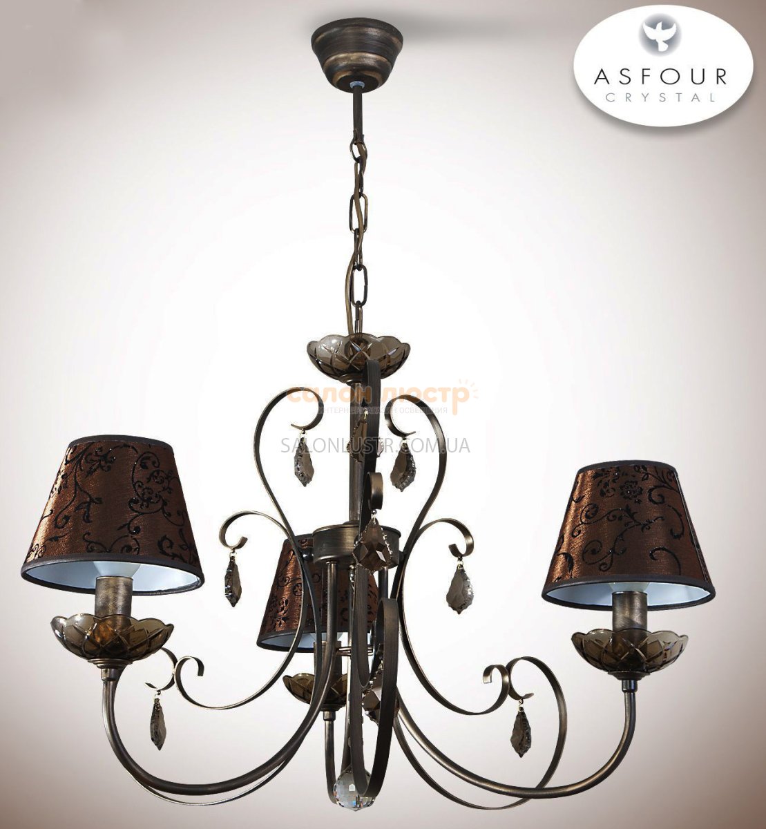 Люстра з абажурами й кришталем виробництва Україна; Матеріал: фарбований метал, кришталь"ASFOUR"; Колір основи: Сірокоричневий - золото - патина; Номер абажура: 67N; Колір тканини абажура: 0101; Висота: 60-75 см; ширина: 68 см; лампи: 3 х Е-14 х 60 Вт.