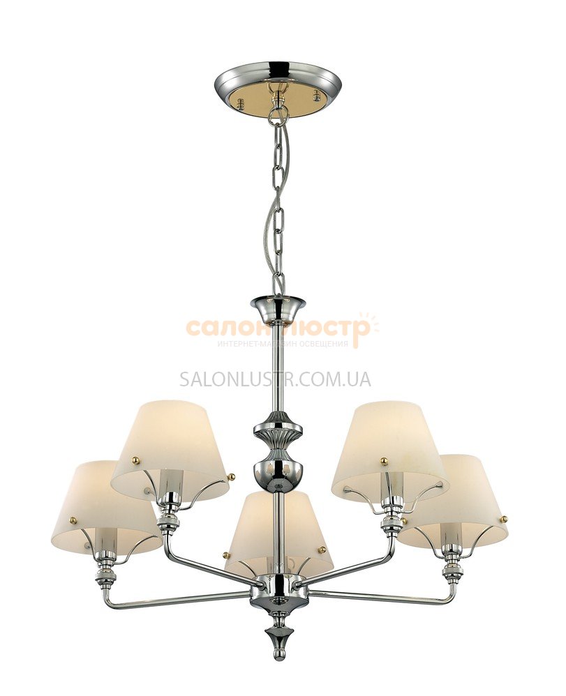 Люстра класична виробництва компанії "BLITZ" (Німеччина); Матеріал: метал, скло; Колір підстави: хром, золото; Колір плафона: білий; Висота: 60-80 см; ширина: 67 см; лампи: 5 х Е14 х 60 Вт.