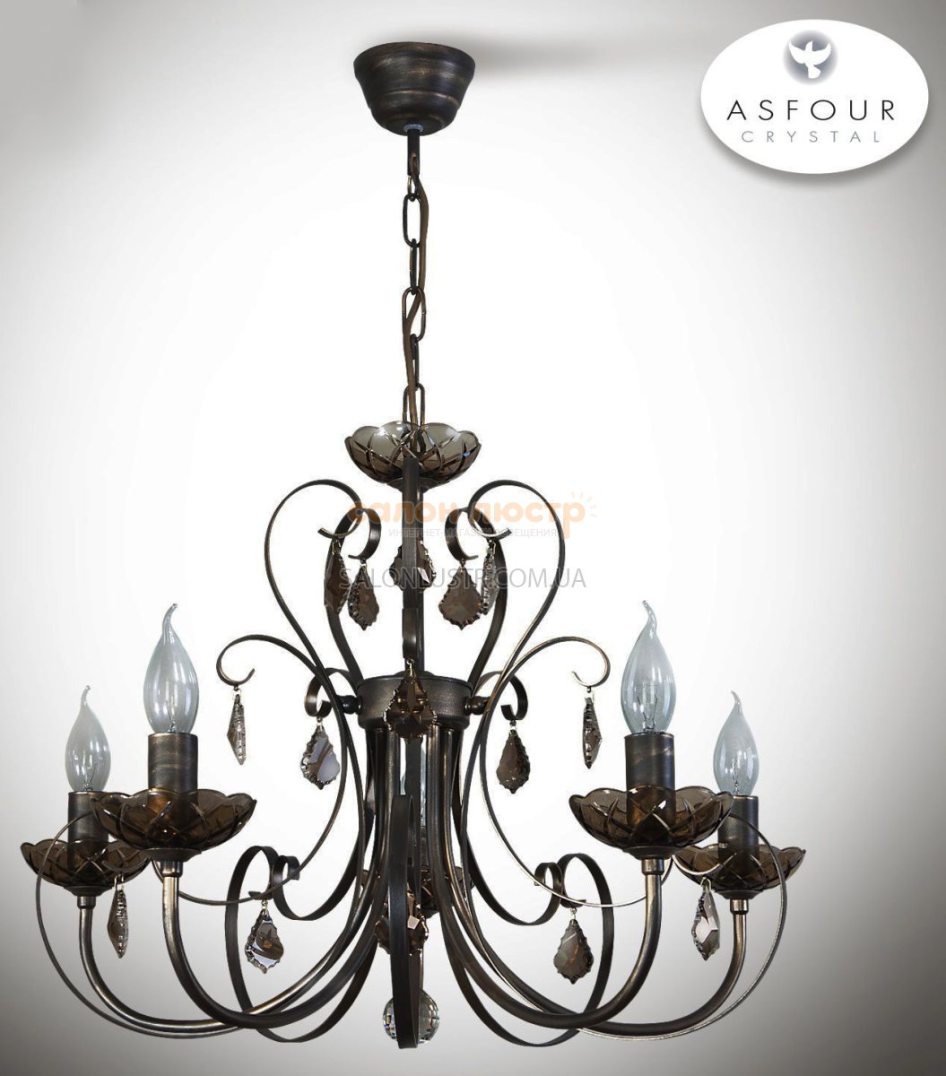 Люстра свічі із кришталем виробництва Україна; Матеріал: фарбований метал, кришталь"ASFOUR"; Колір основи: Сірокоричневий - золото - патина; Висота: 60-75 см; ширина: 65,5 см; лампи: 5 х Е-14 х 60 Вт.