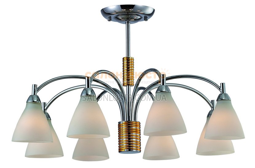 Люстра класична виробництва компанії "BLITZ" (Німеччина); Матеріал: метал / стекло; Колір: хром+золото / білий; Висота: 38,5 см; ширина: 64 см; лампи: 8 х Е14 х 40 Вт.