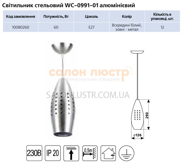 Люстра підвіс виробництва компанії Delux; Матеріал: метал; Колір : матовий хром; Висота: 29 см; діаметр: 12.6 см; лампи: 1 х E27 x 60 Вт .
